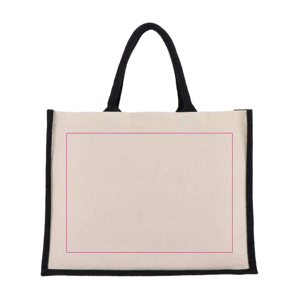 De bedrukking komt op de katoenen canvas panelen te staan voor een scherpe weergave van het ontwerp. De zijden en de bodem van jute zijn niet geschikt voor personalisatie.